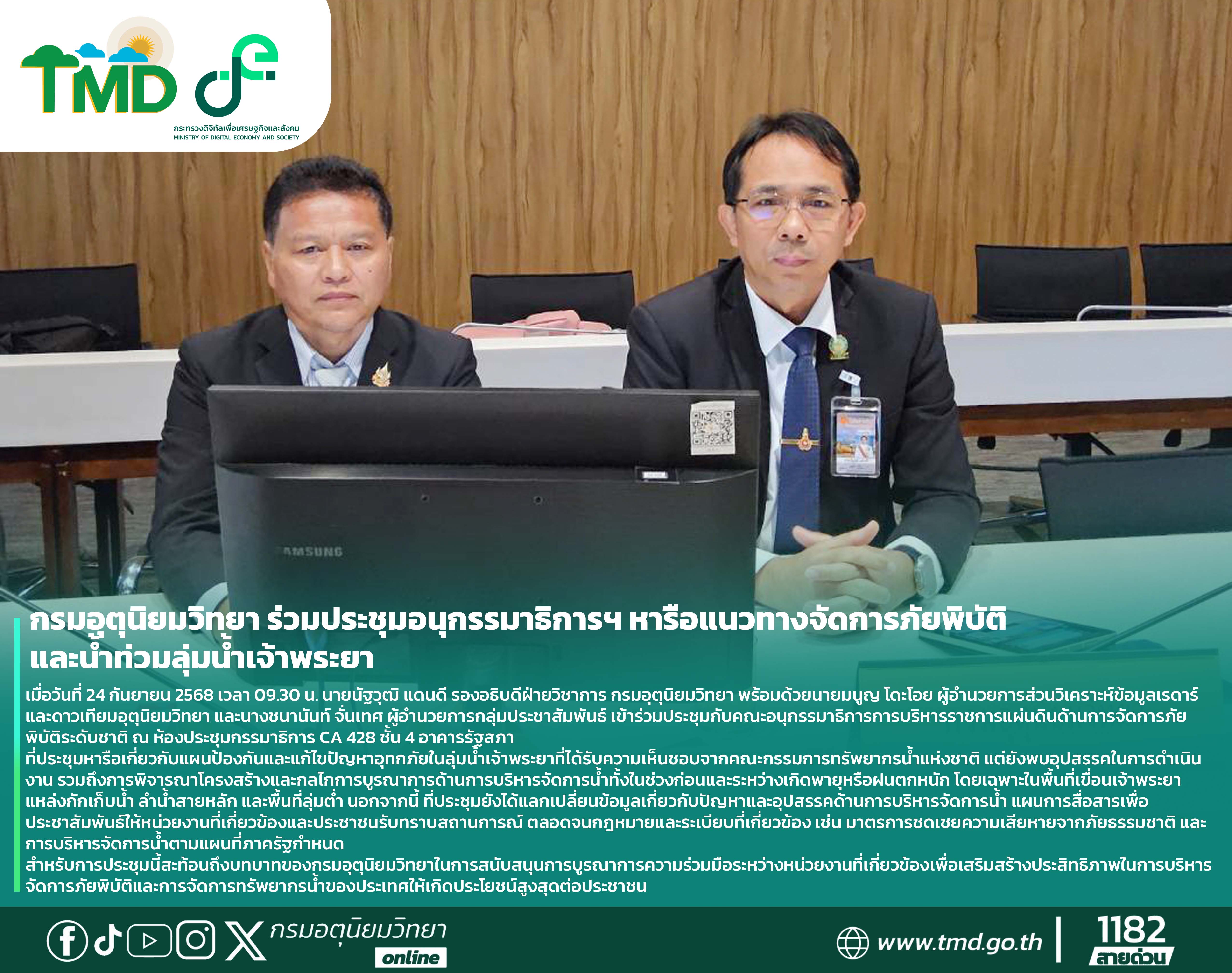 เมื่อวันที่ 24 กันยายน 2568 เวลา 09.30 น. นายนัฐวุฒิ แดนดี รองอธิบดีฝ่ายวิชาการ กรมอุตุนิยมวิทยา พร้อมด้วยนายมนูญ โดะโอย ผู้อำนวยการส่วนวิเคราะห์ข้อมูลเรดาร์และดาวเทียมอุตุนิยมวิทยา และนางชนานันท์ จั่นเทศ ผู้อำนวยการกลุ่มประชาสัมพันธ์ เข้าร่วมประชุมกับคณะอนุกรรมาธิการการบริหารราชการแผ่นดินด้านการจัดการภัยพิบัติระดับชาติ ณ ห้องประชุมกรรมาธิการ CA 428 ชั้น 4 อาคารรัฐสภา