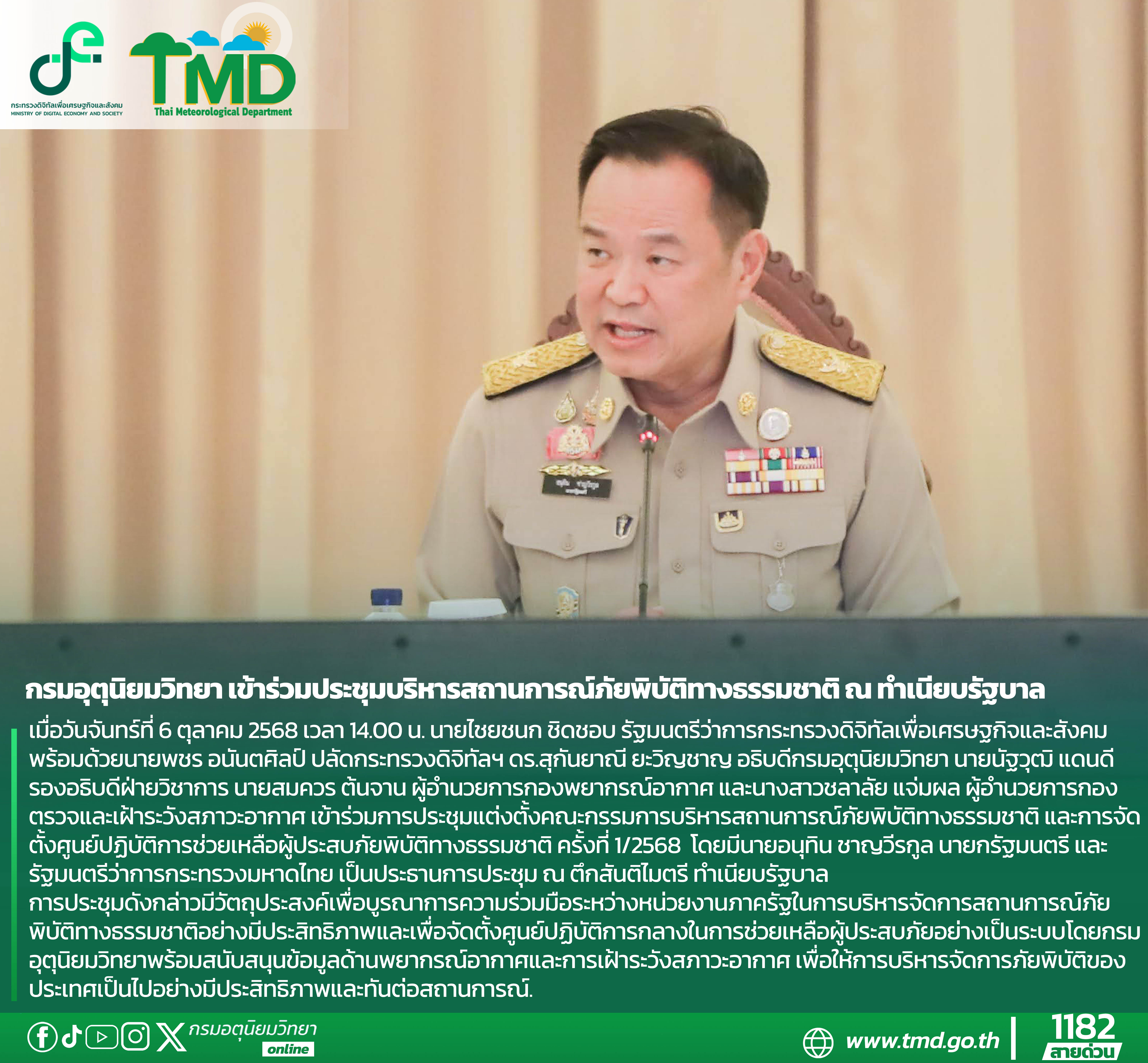 เมื่อวันจันทร์ที่ 6 ตุลาคม 2568 เวลา 14.00 น. นายไชยชนก ชิดชอบ รัฐมนตรีว่าการกระทรวงดิจิทัลเพื่อเศรษฐกิจและสังคม พร้อมด้วยนายพชร อนันตศิลป์ ปลัดกระทรวงดิจิทัลฯ ดร.สุกันยาณี ยะวิญชาญ อธิบดีกรมอุตุนิยมวิทยา นายนัฐวุฒิ แดนดี รองอธิบดีฝ่ายวิชาการ นายสมควร ต้นจาน ผู้อำนวยการกองพยากรณ์อากาศ และนางสาวชลาลัย แจ่มผล ผู้อำนวยการกองตรวจและเฝ้าระวังสภาวะอากาศ เข้าร่วมการประชุมแต่งตั้งคณะกรรมการบริหารสถานการณ์ภัยพิบัติทางธรรมชาติ และการจัดตั้งศูนย์ปฏิบัติการช่วยเหลือผู้ประสบภัยพิบัติทางธรรมชาติ ครั้งที่ 1/2568 โดยมีนายอนุทิน ชาญวีรกูล นายกรัฐมนตรี และรัฐมนตรีว่าการกระทรวงมหาดไทย เป็นประธานการประชุม ณ ตึกสันติไมตรี ทำเนียบรัฐบาล