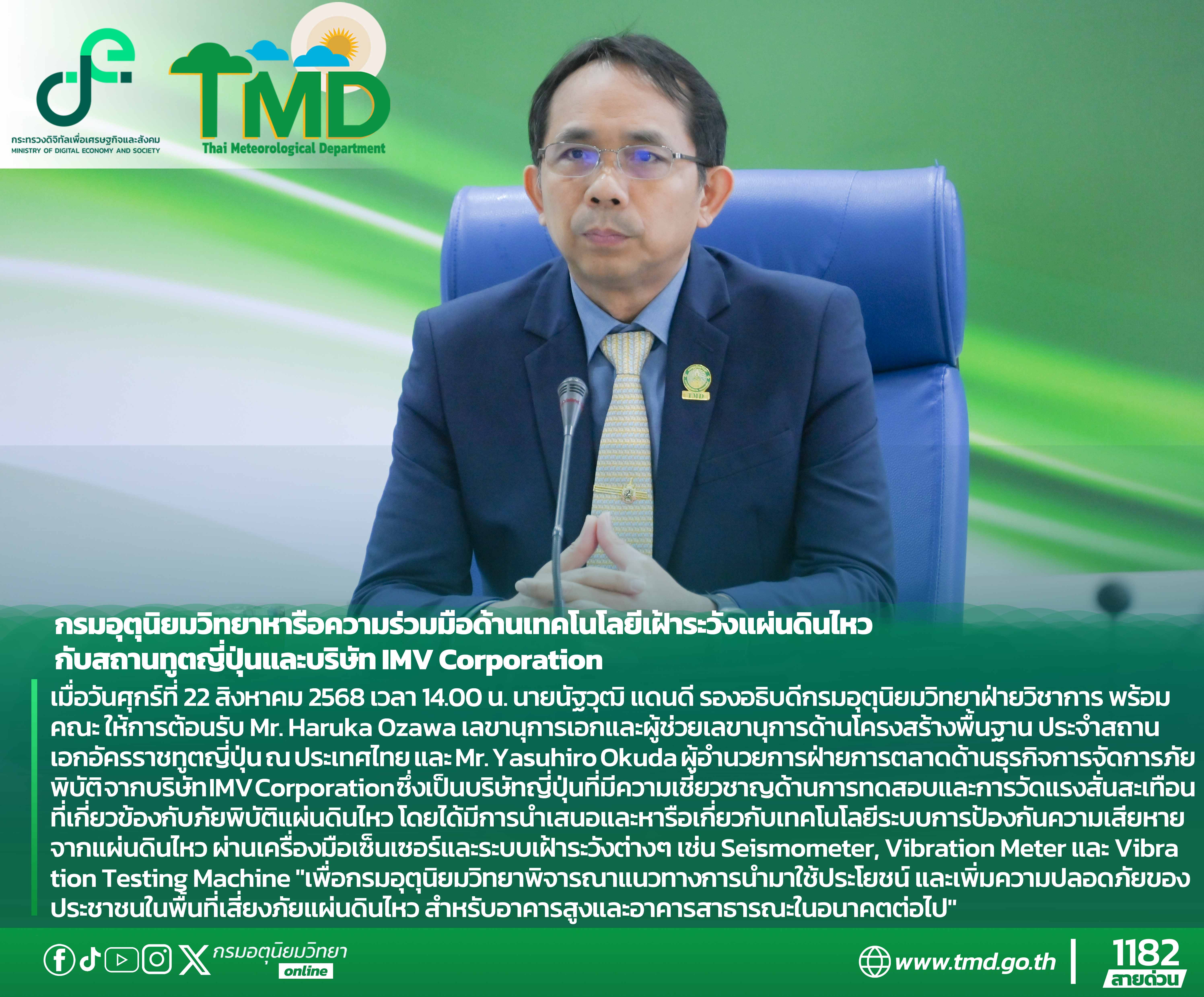 เมื่อวันศุกร์ที่ 22 สิงหาคม 2568 เวลา 14.00 น. นายนัฐวุฒิ แดนดี รองอธิบดีกรมอุตุนิยมวิทยาฝ่ายวิชาการ พร้อมคณะ ให้การต้อนรับ Mr. Haruka Ozawa เลขานุการเอกและผู้ช่วยเลขานุการด้านโครงสร้างพื้นฐาน ประจำสถานเอกอัครราชทูตญี่ปุ่น ประจำประเทศไทย และ Mr. Yasuhiro Okuda ผู้อำนวยการฝ่ายการตลาดด้านธุรกิจการจัดการภัยพิบัติ จากบริษัท IMV Corporation ซึ่งเป็นบริษัทญี่ปุ่นที่มีความเชี่ยวชาญด้านการทดสอบและการวัดแรงสั่นสะเทือนที่เกี่ยวข้องกับภัยพิบัติแผ่นดินไหว ณ ห้องประชุมไพลิน ชั้น 3 อาคาร 50 ปี อุตุนิยมวิทยา โดยที่ประชุมได้มีการนำเสนอและหารือเกี่ยวกับเทคโนโลยีระบบการป้องกันความเสียหายจากแผ่นดินไหว ผ่านเครื่องมือเซ็นเซอร์และระบบเฝ้าระวังต่างๆ เช่น Seismometer, Vibration Meter และ Vibration Testing Machine เพื่อกรมอุตุนิยมวิทยาพิจารณาแนวทางการนำมาใช้ประโยชน์ และเพิ่มความปลอดภัยของประชาชนในพื้นที่เสี่ยงภัยแผ่นดินไหว สำหรับอาคารสูงและอาคารสาธารณะในอนาคตต่อไป