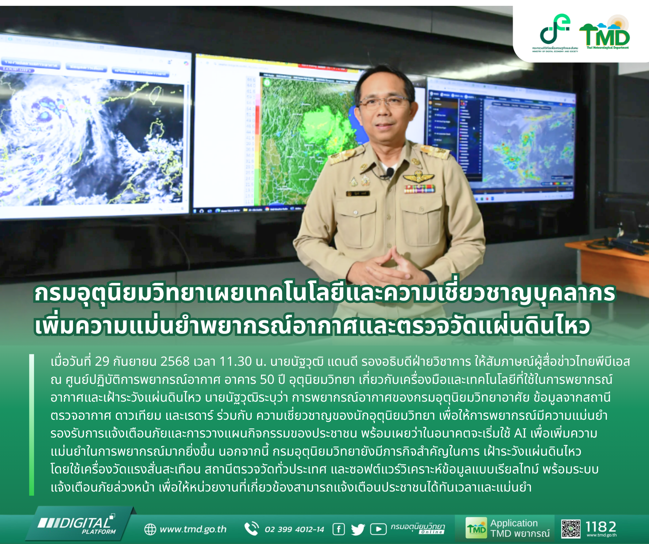 เมื่อวันที่ 29 กันยายน 2568 เวลา 11.30 น. นายนัฐวุฒิ แดนดี รองอธิบดีฝ่ายวิชาการ ให้สัมภาษณ์ผู้สื่อข่าวไทยพีบีเอส ณ ศูนย์ปฏิบัติการพยากรณ์อากาศ อาคาร 50 ปี อุตุนิยมวิทยา เกี่ยวกับเครื่องมือและเทคโนโลยีที่ใช้ในการพยากรณ์อากาศและเฝ้าระวังแผ่นดินไหว