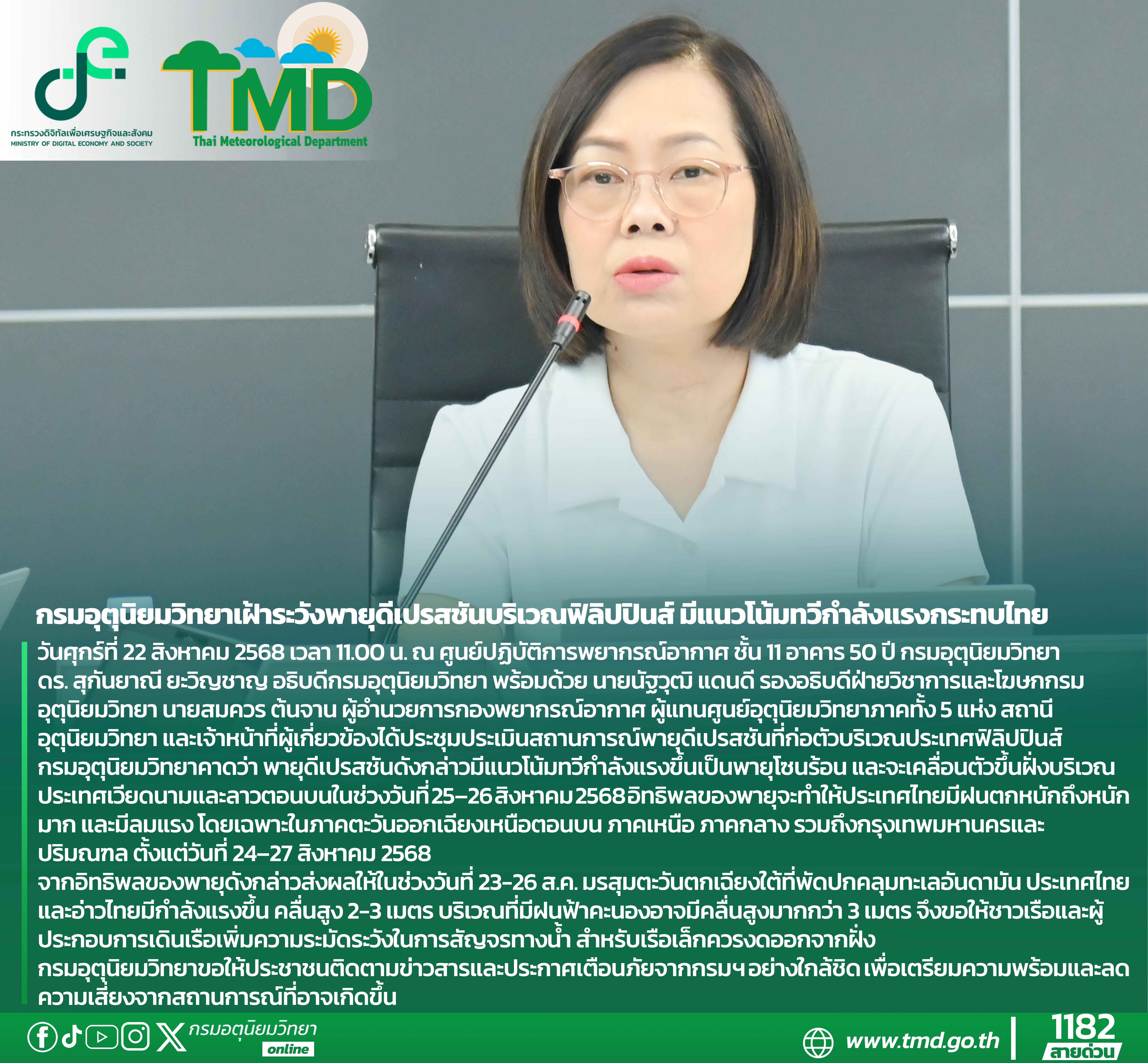 วันศุกร์ที่ 22 สิงหาคม 2568 เวลา 11.00 น. ณ ศูนย์ปฏิบัติการพยากรณ์อากาศ ชั้น 11 อาคาร 50 ปี กรมอุตุนิยมวิทยา ดร. สุกันยาณี ยะวิญชาญ อธิบดีกรมอุตุนิยมวิทยา พร้อมด้วย นายนัฐวุฒิ แดนดี รองอธิบดีฝ่ายวิชาการและโฆษกกรมอุตุนิยมวิทยา นายสมควร ต้นจาน ผู้อำนวยการกองพยากรณ์อากาศ ผู้แทนศูนย์อุตุนิยมวิทยาภาคทั้ง 5 แห่ง สถานีอุตุนิยมวิทยา และเจ้าหน้าที่ผู้เกี่ยวข้องได้ประชุมประเมินสถานการณ์พายุดีเปรสชันที่ก่อตัวบริเวณประเทศฟิลิปปินส์