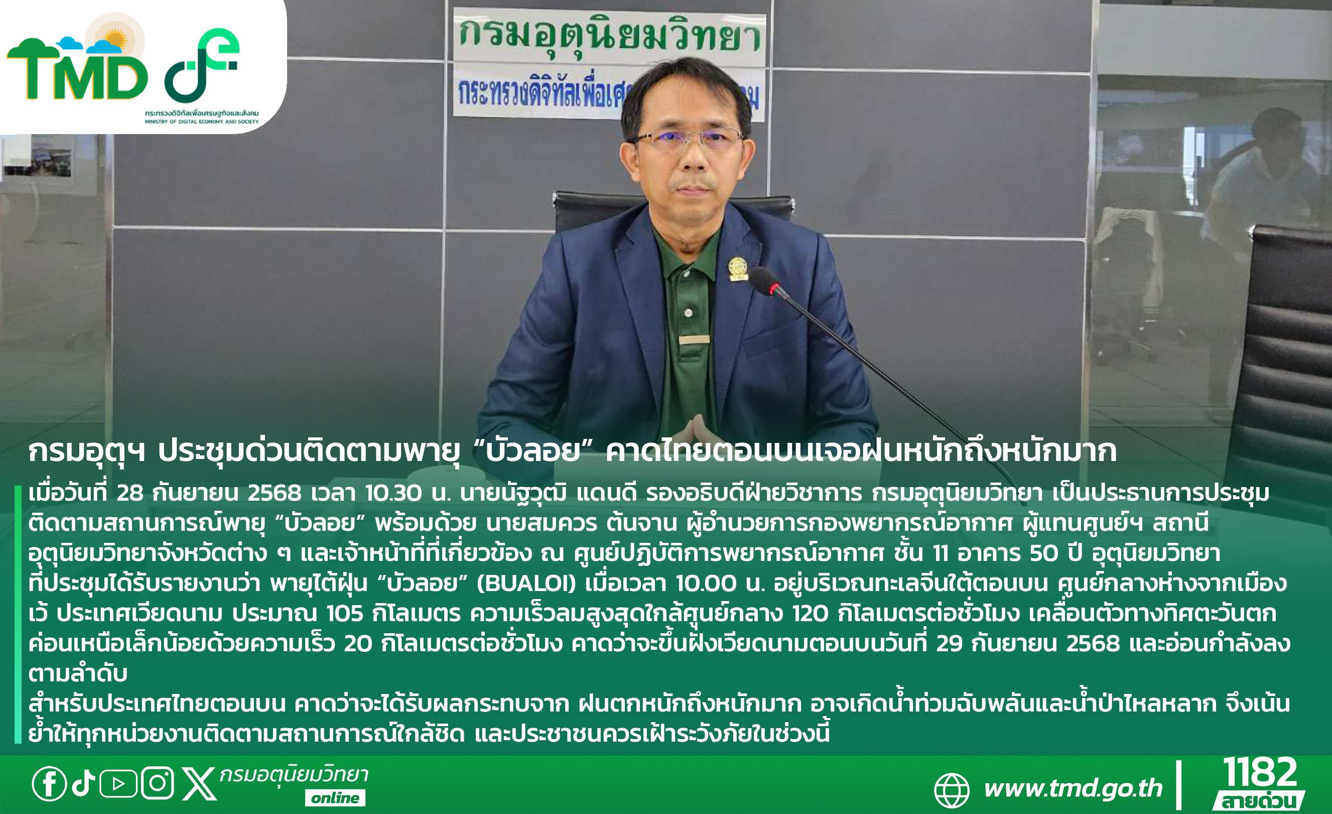 เมื่อวันที่ 28 กันยายน 2568 เวลา 10.30 น. นายนัฐวุฒิ แดนดี รองอธิบดีฝ่ายวิชาการ กรมอุตุนิยมวิทยา เป็นประธานการประชุมติดตามสถานการณ์พายุ “บัวลอย” พร้อมด้วย นายสมควร ต้นจาน ผู้อำนวยการกองพยากรณ์อากาศ ผู้แทนศูนย์ฯ สถานีอุตุนิยมวิทยาจังหวัดต่าง ๆ และเจ้าหน้าที่ที่เกี่ยวข้อง ณ ศูนย์ปฏิบัติการพยากรณ์อากาศ ชั้น 11 อาคาร 50 ปี อุตุนิยมวิทยา