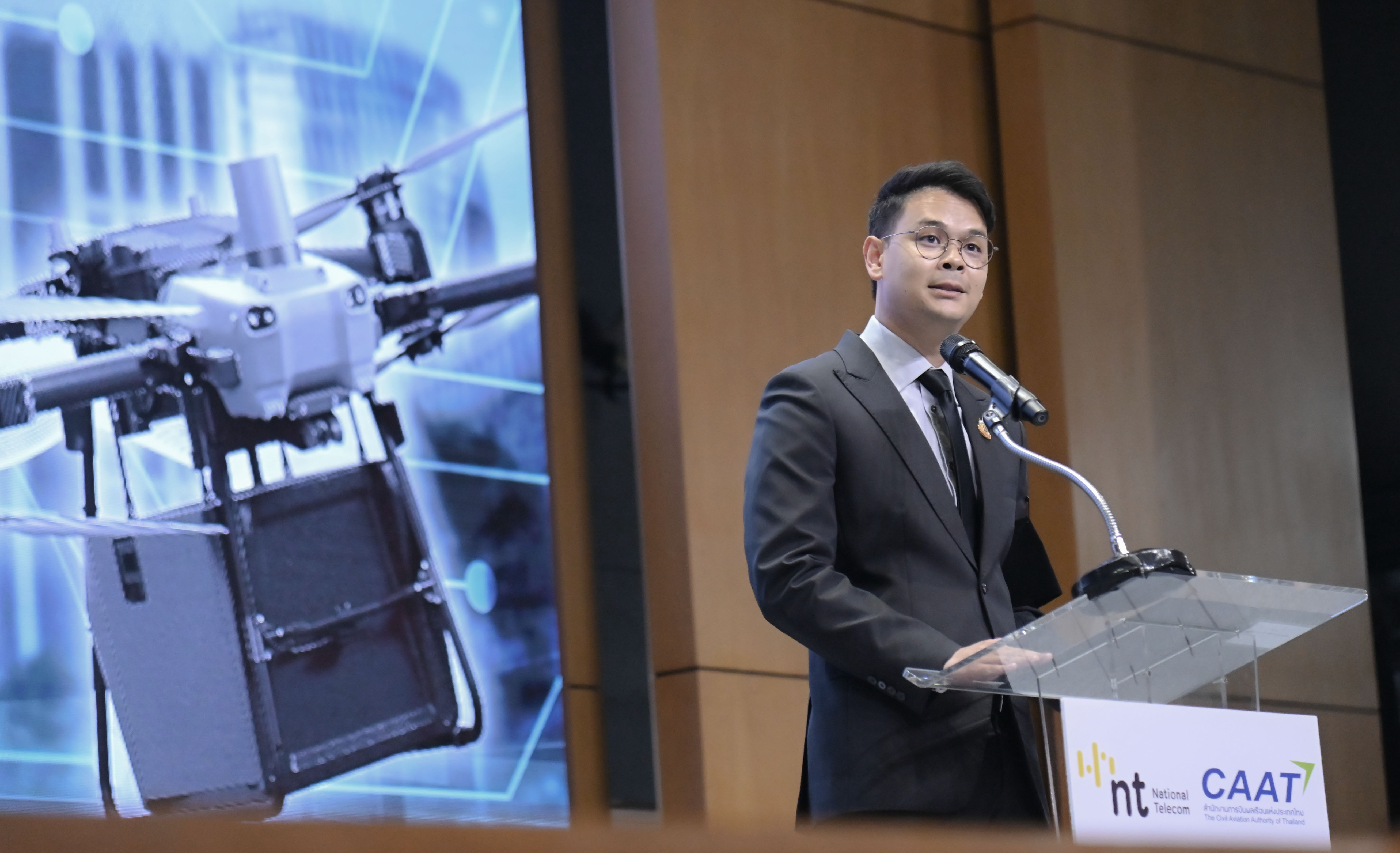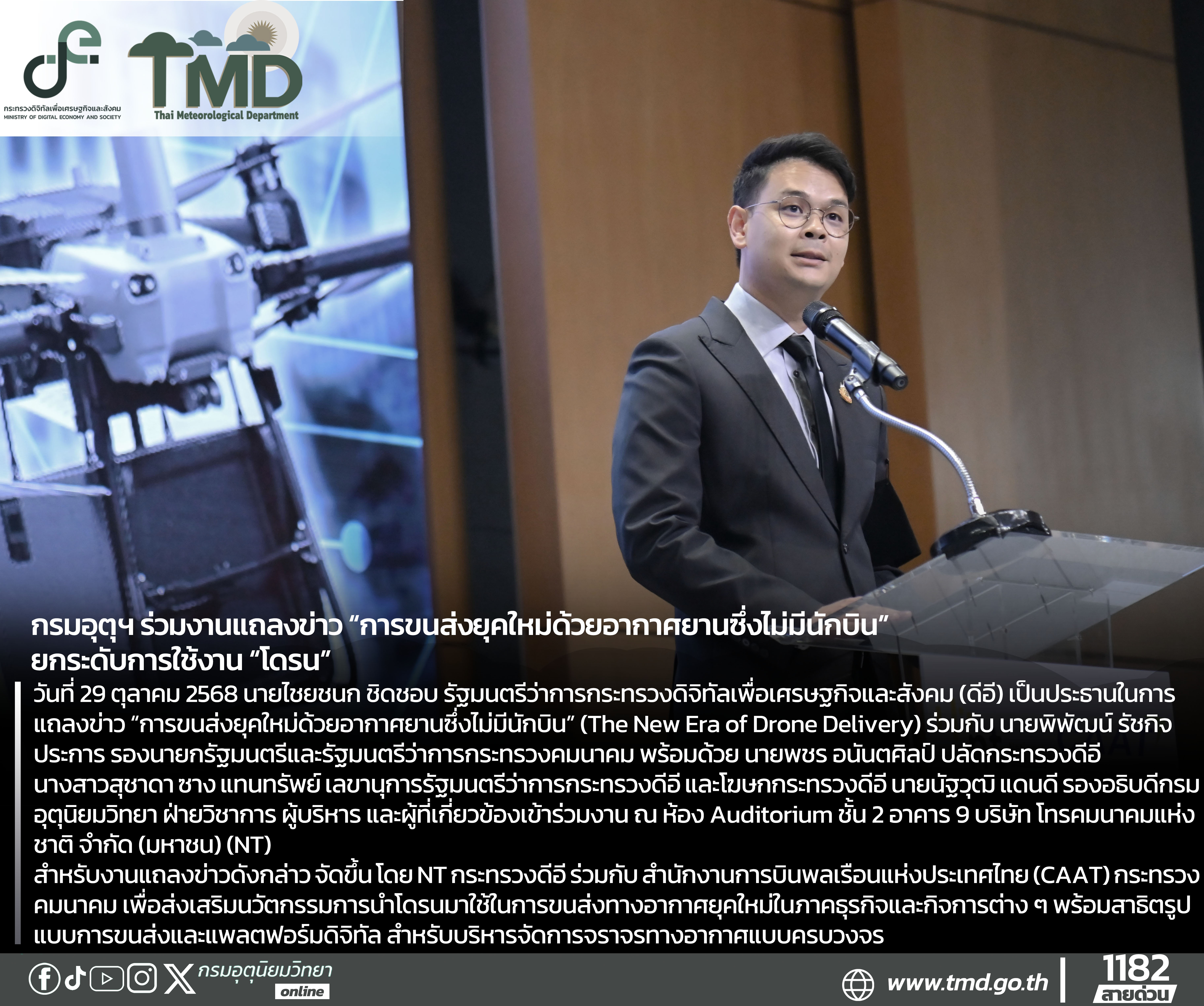 วันที่ 29 ตุลาคม 2568 นายไชยชนก ชิดชอบ รัฐมนตรีว่าการกระทรวงดิจิทัลเพื่อเศรษฐกิจและสังคม (ดีอี) เป็นประธานในการแถลงข่าว “การขนส่งยุคใหม่ด้วยอากาศยานซึ่งไม่มีนักบิน” (The New Era of Drone Delivery) ร่วมกับ นายพิพัฒน์ รัชกิจประการ รองนายกรัฐมนตรีและรัฐมนตรีว่าการกระทรวงคมนาคม พร้อมด้วย นายพชร อนันตศิลป์ ปลัดกระทรวงดีอี นางสาวสุชาดา ซาง แทนทรัพย์ เลขานุการรัฐมนตรีว่าการกระทรวงดีอี และโฆษกกระทรวงดีอี นายนัฐวุฒิ แดนดี รองอธิบดีกรมอุตุนิยมวิทยา ฝ่ายวิชาการ ผู้บริหาร และผู้ที่เกี่ยวข้องเข้าร่วมงาน ณ ห้อง Auditorium ชั้น 2 อาคาร 9 บริษัท โทรคมนาคมแห่งชาติ จำกัด (มหาชน) (NT)