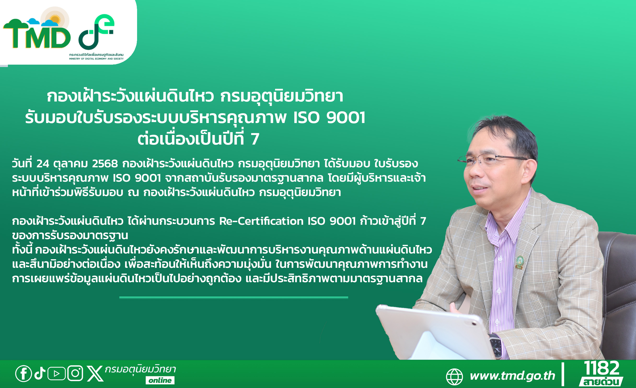 วันที่ 24 ตุลาคม 2568 กองเฝ้าระวังแผ่นดินไหว กรมอุตุนิยมวิทยา ได้รับมอบ ใบรับรองระบบบริหารคุณภาพ ISO 9001 จากสถาบันรับรองมาตรฐานสากล โดยมีผู้บริหารและเจ้าหน้าที่เข้าร่วมพิธีรับมอบ ณ กองเฝ้าระวังแผ่นดินไหว กรมอุตุนิยมวิทยา