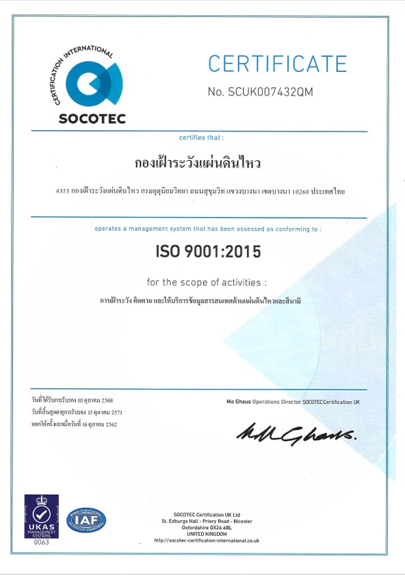 ทั้งนี้ กองเฝ้าระวังแผ่นดินไหวยังคงรักษาและพัฒนาการบริหารงานคุณภาพด้านแผ่นดินไหวและสึนามิอย่างต่อเนื่อง เพื่อสะท้อนให้เห็นถึงความมุ่งมั่น ในการพัฒนาคุณภาพการทำงาน การเผยแพร่ข้อมูลแผ่นดินไหวเป็นไปอย่างถูกต้อง และมีประสิทธิภาพตามมาตรฐานสากล
