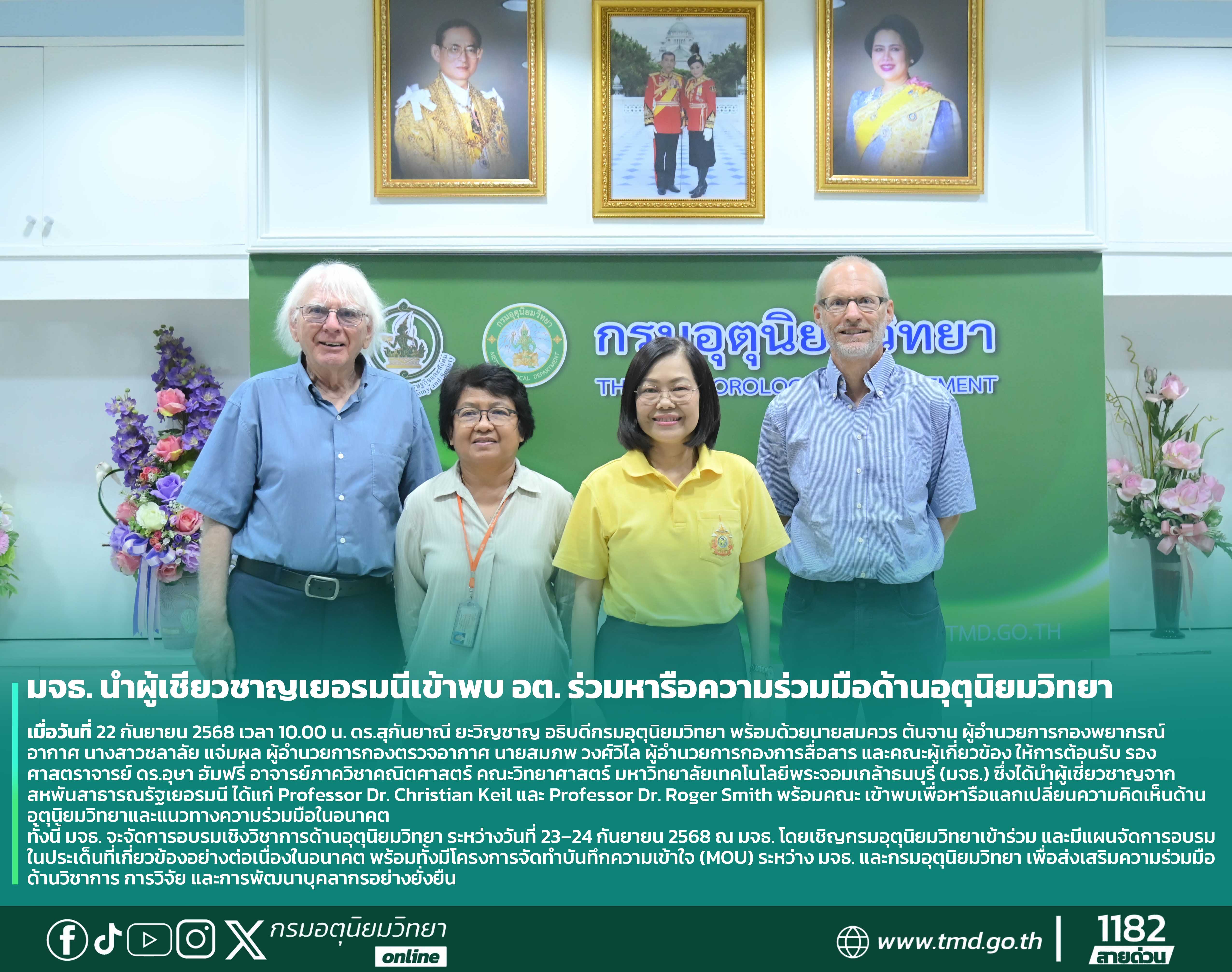 เมื่อวันที่ 22 กันยายน 2568 เวลา 10.00 น. ดร.สุกันยาณี ยะวิญชาญ อธิบดีกรมอุตุนิยมวิทยา พร้อมด้วยนายสมควร ต้นจาน ผู้อำนวยการกองพยากรณ์อากาศ นางสาวชลาลัย แจ่มผล ผู้อำนวยการกองตรวจและเฝ้าระวังสภาวะอากาศ นายสมภพ วงศ์วิไล ผู้อำนวยการกองการสื่อสาร และคณะผู้เกี่ยวข้อง ให้การต้อนรับ รองศาสตราจารย์ ดร.อุษา ฮัมฟรี่ อาจารย์ภาควิชาคณิตศาสตร์ คณะวิทยาศาสตร์ มหาวิทยาลัยเทคโนโลยีพระจอมเกล้าธนบุรี (มจธ.) ซึ่งได้นำผู้เชี่ยวชาญจากสหพันธ์สาธารณรัฐเยอรมนี ได้แก่ Professor Dr. Christian Keil และ Professor Dr. Roger Smith พร้อมคณะ เข้าพบเพื่อหารือแลกเปลี่ยนความคิดเห็นด้านอุตุนิยมวิทยาและแนวทางความร่วมมือในอนาคต