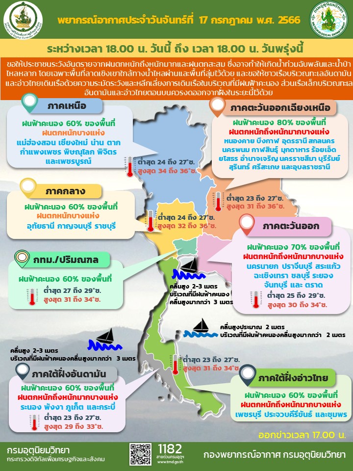 พยากรณ์อากาศ 24 ชั่วโมงข้างหน้า ร่องมรสุมพาดผ่านภาคเหนือตอนบนและภาคตะวันออกเฉียงเหนือตอนบน ประกอบกับมรสุมตะวันตกเฉียงใต้ที่พัดปกคลุมทะเลอันดามัน ภาคใต้ และอ่าวไทยมีกำลังค่อนข้างแรง ลักษณะเช่นนี้ทำให้ประเทศไทยมีฝนเพิ่มขึ้นและมีฝนตกหนักบางแห่ง โดยมีฝนตกหนักมากบางพื้นที่ใน