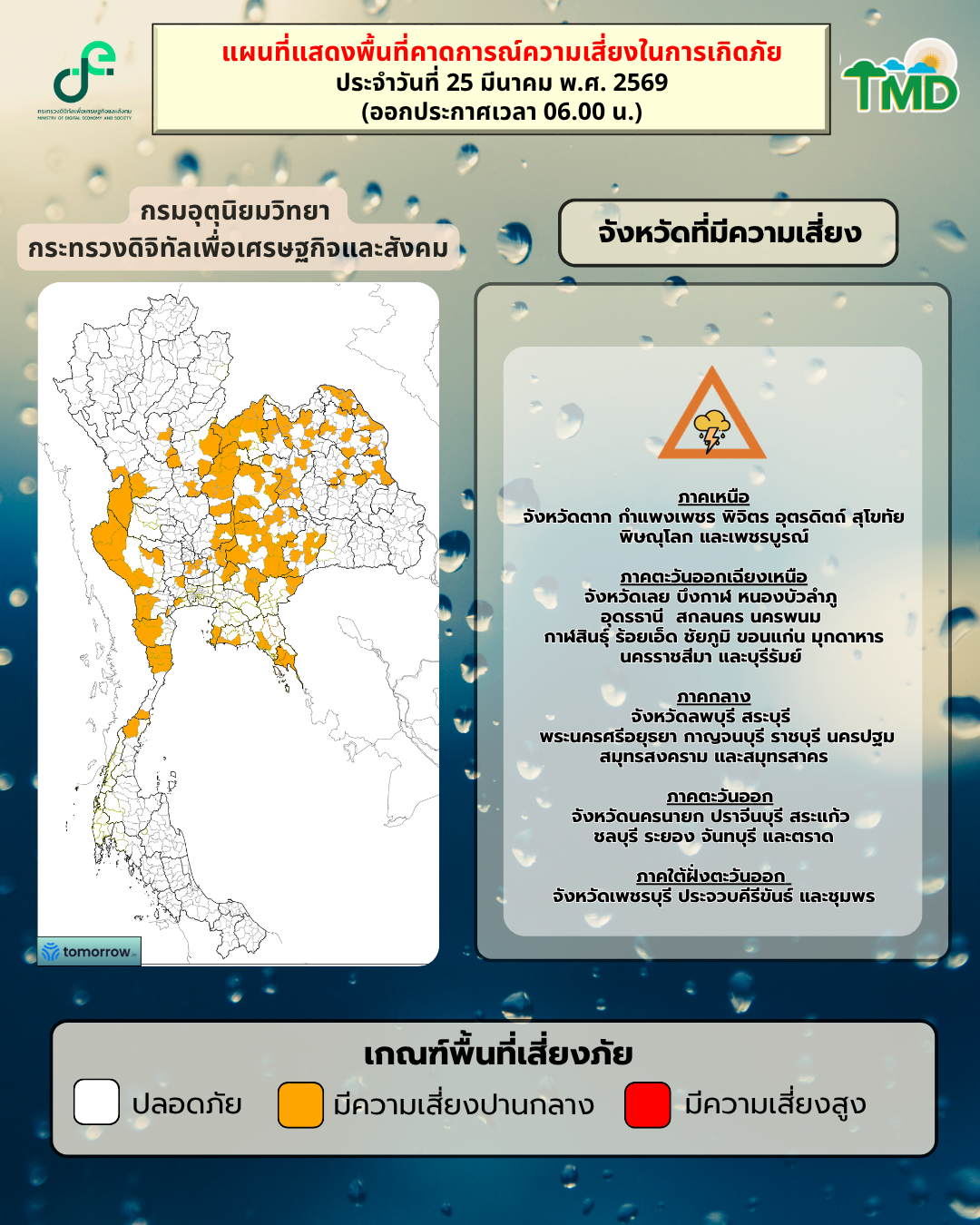 แผนที่แสดงพื้นที่คาดการณ์ความเสี่ยงในการเกิดภัยประจำวันที่ 25 มีนาคม 2569 ออกข่าวเวลา 05.00 น.