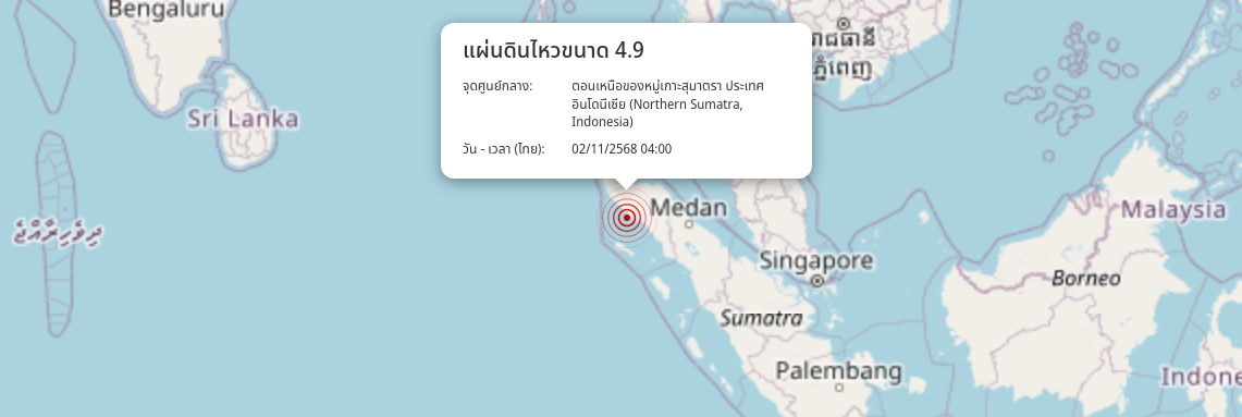 แผ่นดินไหว ตอนเหนือของหมู่เกาะสุมาตรา ประเทศอินโดนีเซีย (Northern Sumatra, Indonesia) ขนาด 4.9