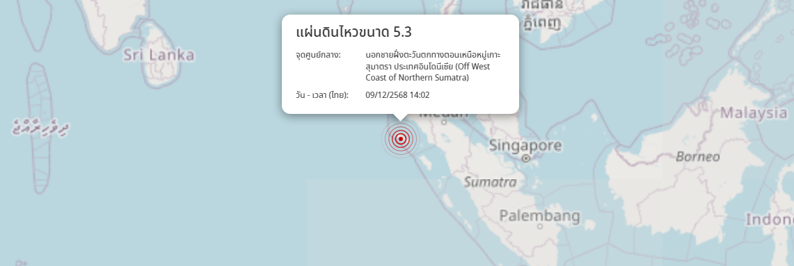 แผ่นดินไหว นอกชายฝั่งตะวันตกทางตอนเหนือหมู่เกาะสุมาตรา ประเทศอินโดนีเซีย (Off West Coast of Northern Sumatra) ขนาด 5.3