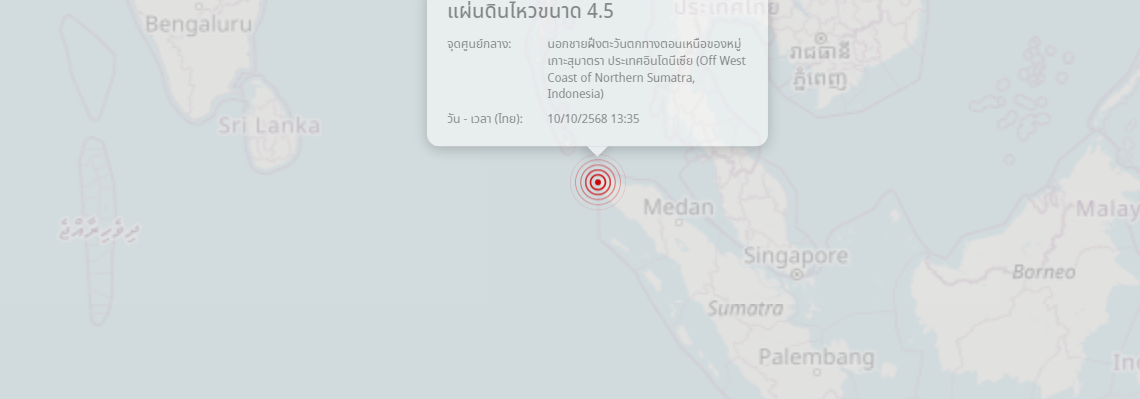 แผ่นดินไหว นอกชายฝั่งตะวันตกทางตอนเหนือของหมู่เกาะสุมาตรา ประเทศอินโดนีเซีย (Off West Coast of Northern Sumatra, Indonesia) ขนาด 4.5