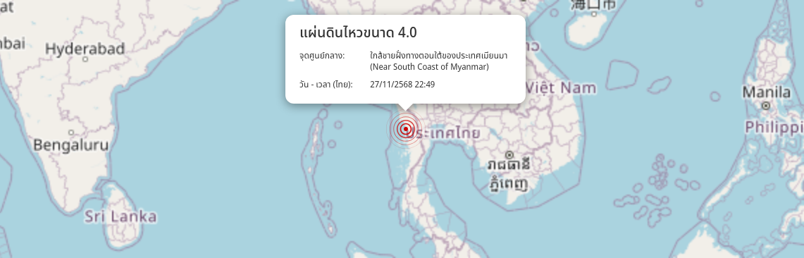 แผ่นดินไหว ใกล้ชายฝั่งทางตอนใต้ของประเทศเมียนมา (Near South Coast of Myanmar) ขนาด 4.0