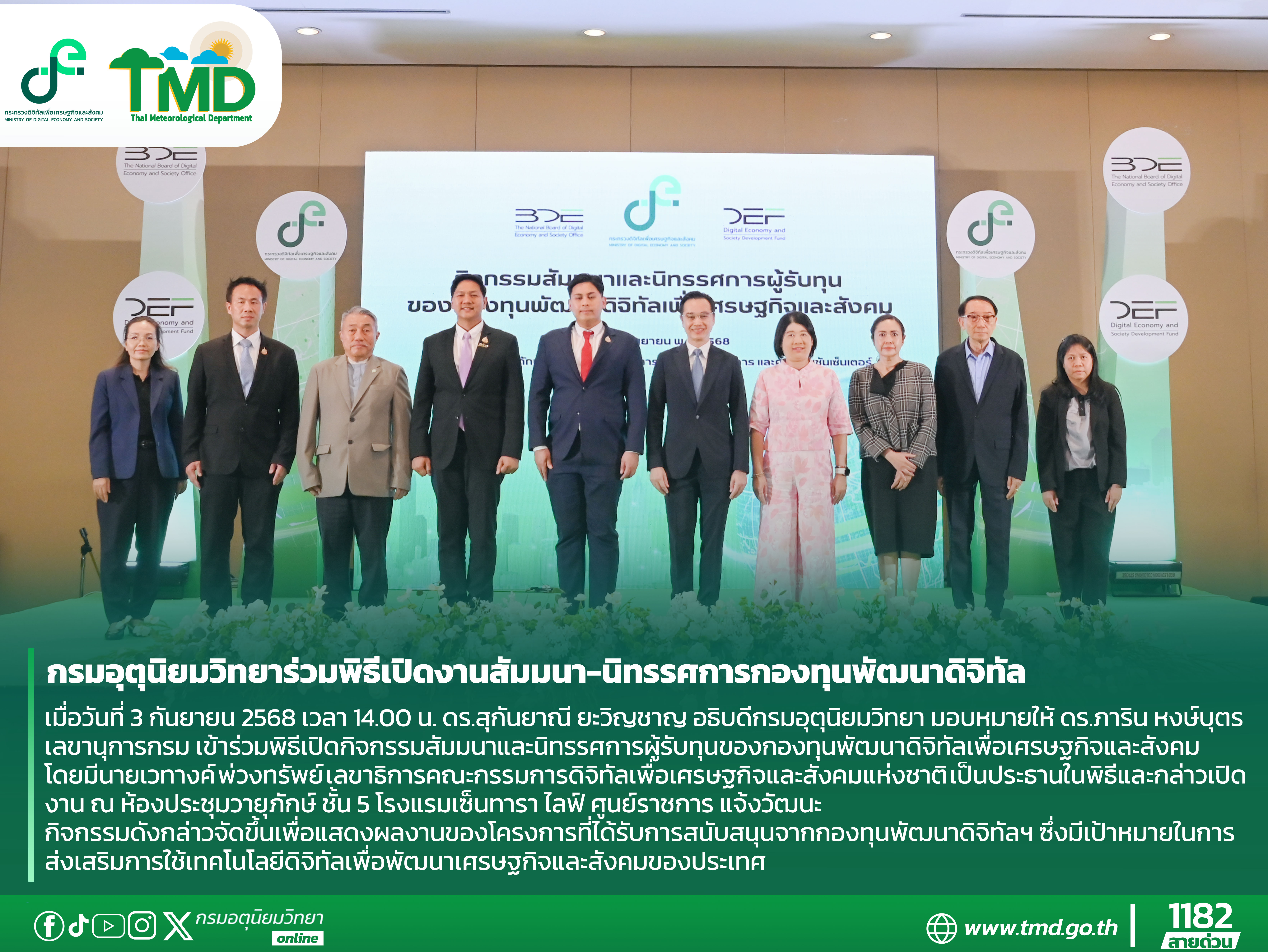 เมื่อวันที่ 3 กันยายน 2568 เวลา 14.00 น. ดร.สุกันยาณี ยะวิญชาญ อธิบดีกรมอุตุนิยมวิทยา มอบหมายให้ ดร.ภาริน หงษ์บุตร เลขานุการกรม เข้าร่วมพิธีเปิดกิจกรรมสัมมนาและนิทรรศการผู้รับทุนของกองทุนพัฒนาดิจิทัลเพื่อเศรษฐกิจและสังคม โดยมีนายเวทางค์ พ่วงทรัพย์ เลขาธิการคณะกรรมการดิจิทัลเพื่อเศรษฐกิจและสังคมแห่งชาติ เป็นประธานในพิธีและกล่าวเปิดงาน ณ ห้องประชุมวายุภักษ์ ชั้น 5 โรงแรมเซ็นทารา ไลฟ์ ศูนย์ราชการ แจ้งวัฒนะ