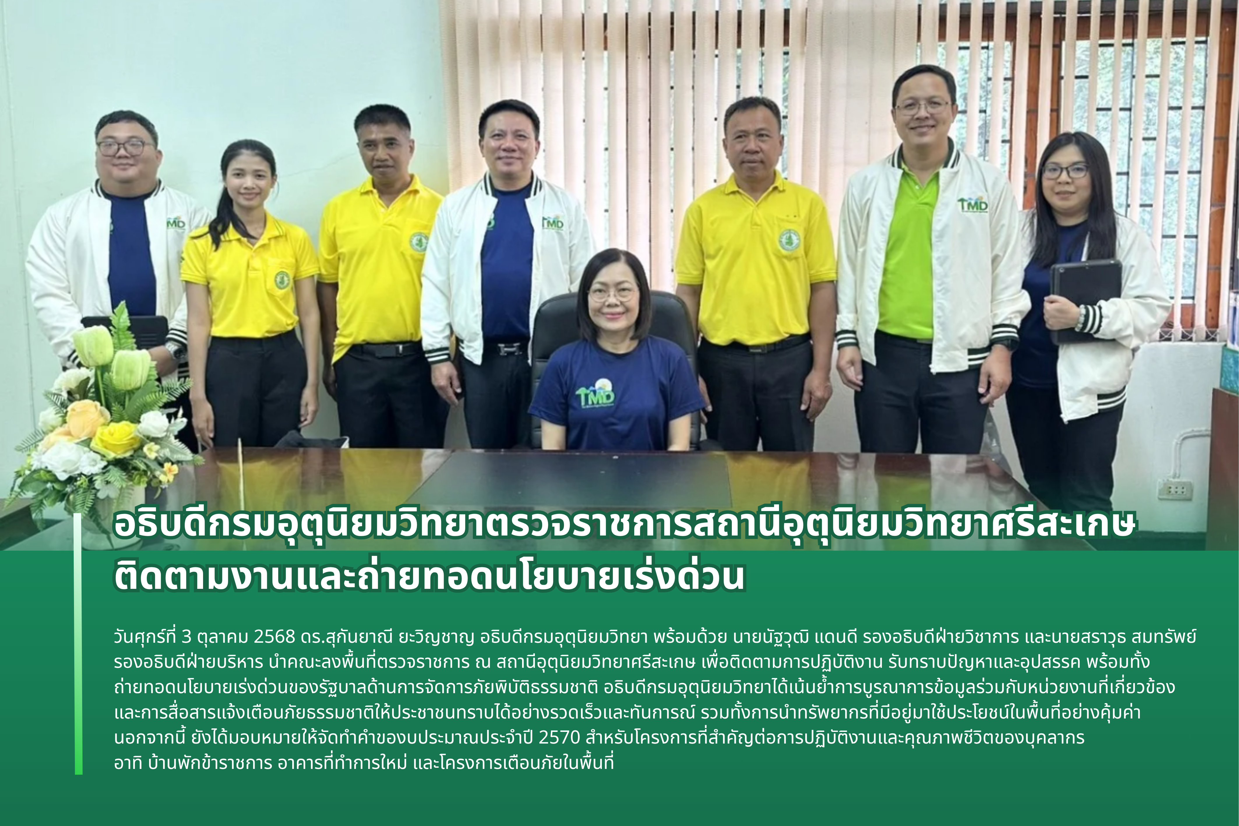 วันศุกร์ที่ 3 ตุลาคม 2568 ดร.สุกันยาณี ยะวิญชาญ อธิบดีกรมอุตุนิยมวิทยา พร้อมด้วย นายนัฐวุฒิ แดนดี รองอธิบดีฝ่ายวิชาการ นายสราวุธ สมทรัพย์ รองอธิบดีฝ่ายบริหาร และนายสุรพงษ์ สารปะ ผู้อำนวยการศูนย์อุตุนิยมวิทยาภาคตะวันออกเฉียงเหนือตอนล่าง นำคณะลงพื้นที่ตรวจราชการ ณ สถานีอุตุนิยมวิทยาศรีสะเกษ เพื่อติดตามการปฏิบัติงาน รับทราบปัญหาและอุปสรรค พร้อมทั้งถ่ายทอดนโยบายเร่งด่วนของรัฐบาลด้านการจัดการภัยพิบัติธรรมชาติ