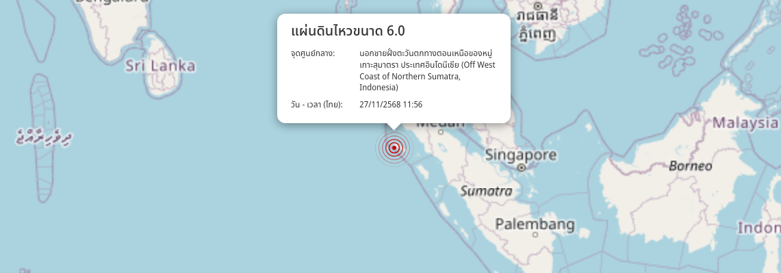 แผ่นดินไหว นอกชายฝั่งตะวันตกทางตอนเหนือของหมู่เกาะสุมาตรา ประเทศอินโดนีเซีย (Off West Coast of Northern Sumatra, Indonesia) ขนาด 6.0
