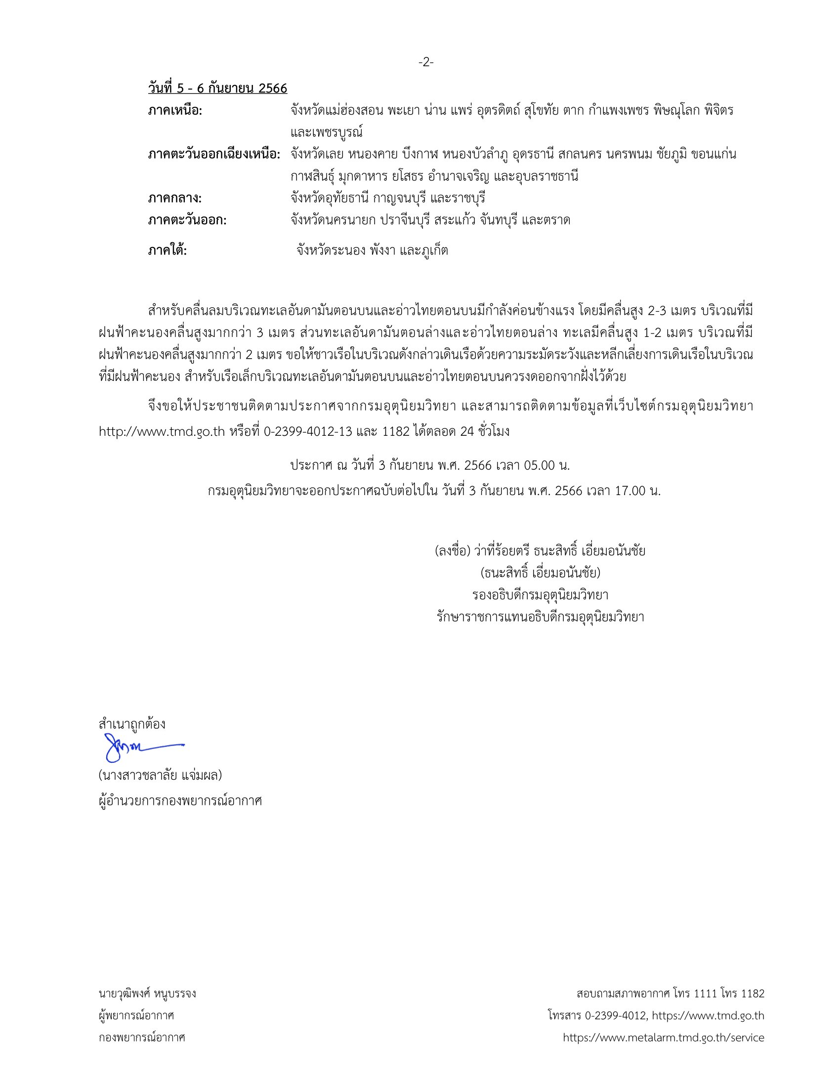 ฝนตกหนักถึงหนักมากบริเวณประเทศไทย และคลื่นลมแรงบริเวณทะเลอันดามันตอนบนและอ่าวไทยตอนบน ฉบับที่ 15 (240/2566) (มีผลกระทบจนถึงวันที่ 6 กันยายน 2566)